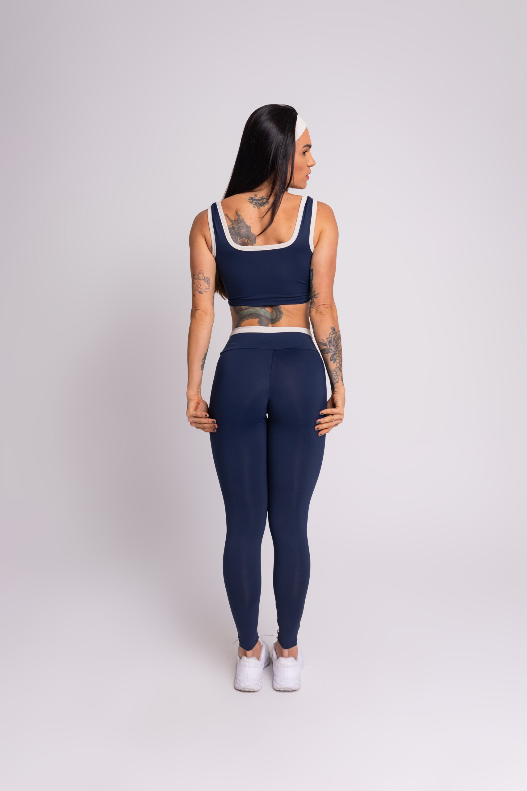 Ambas as peças compartilham o detalhe bicolor nas barras e cós, unificando o look com um toque esportivo e sofisticado. O top um pouco mais alongado e decote quadrado, clássico e atual, com alças largas que oferecem suporte robusto e conforto. A legging possui cós alto que proporciona compressão e segurança abdominal, ajudando a modelar a cintura com eficácia. Seu caimento justo se mantém no lugar, garantindo total liberdade de movimento.