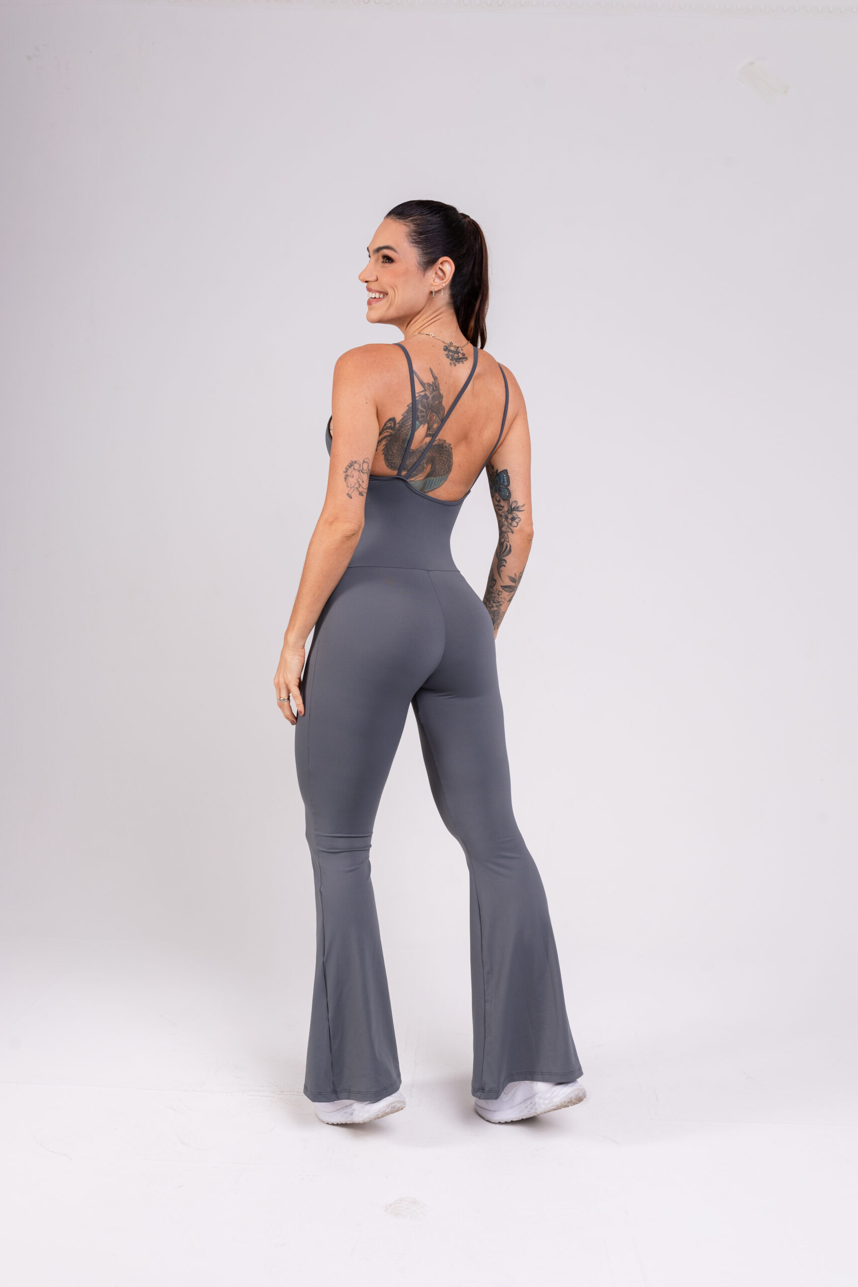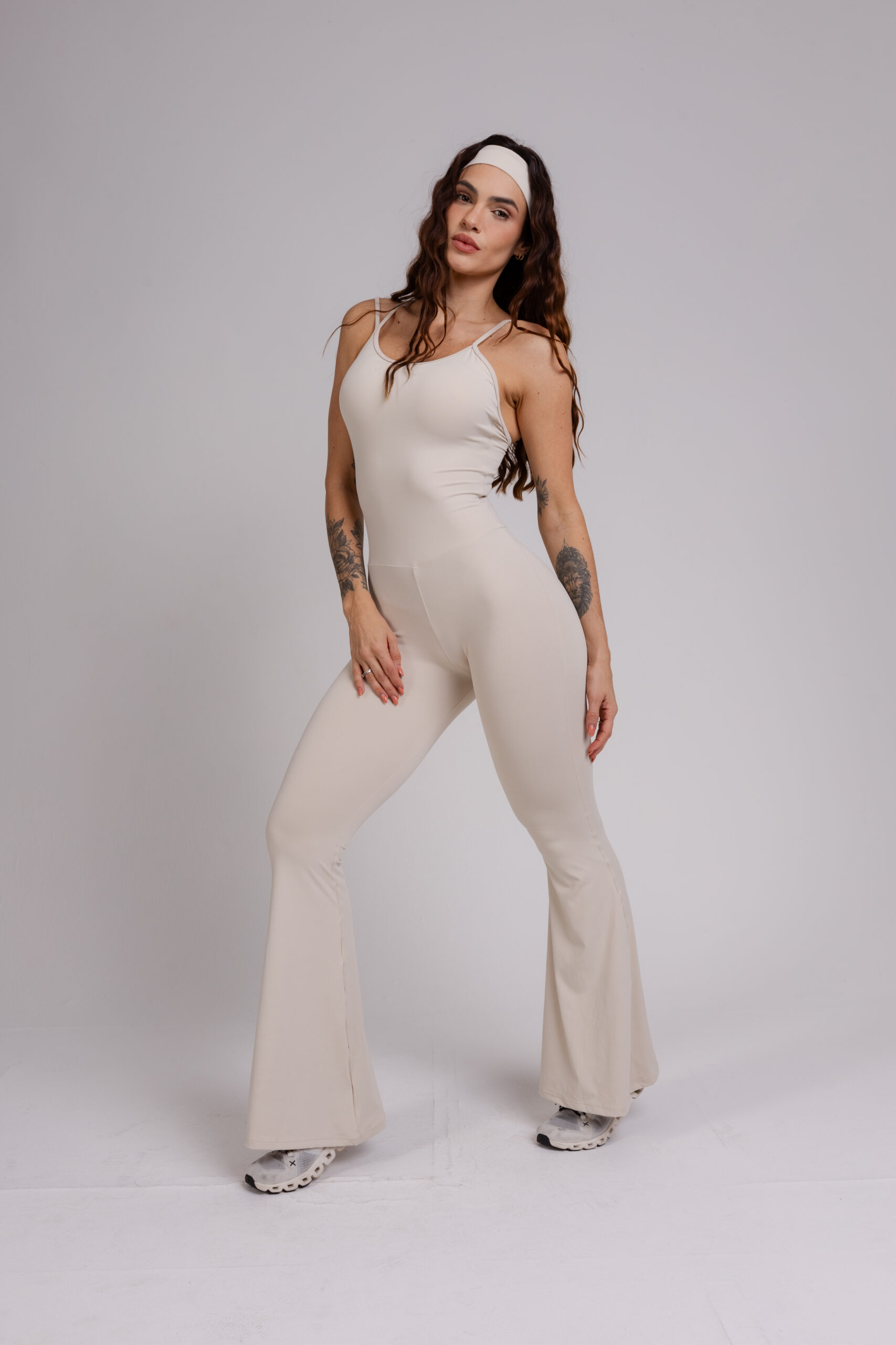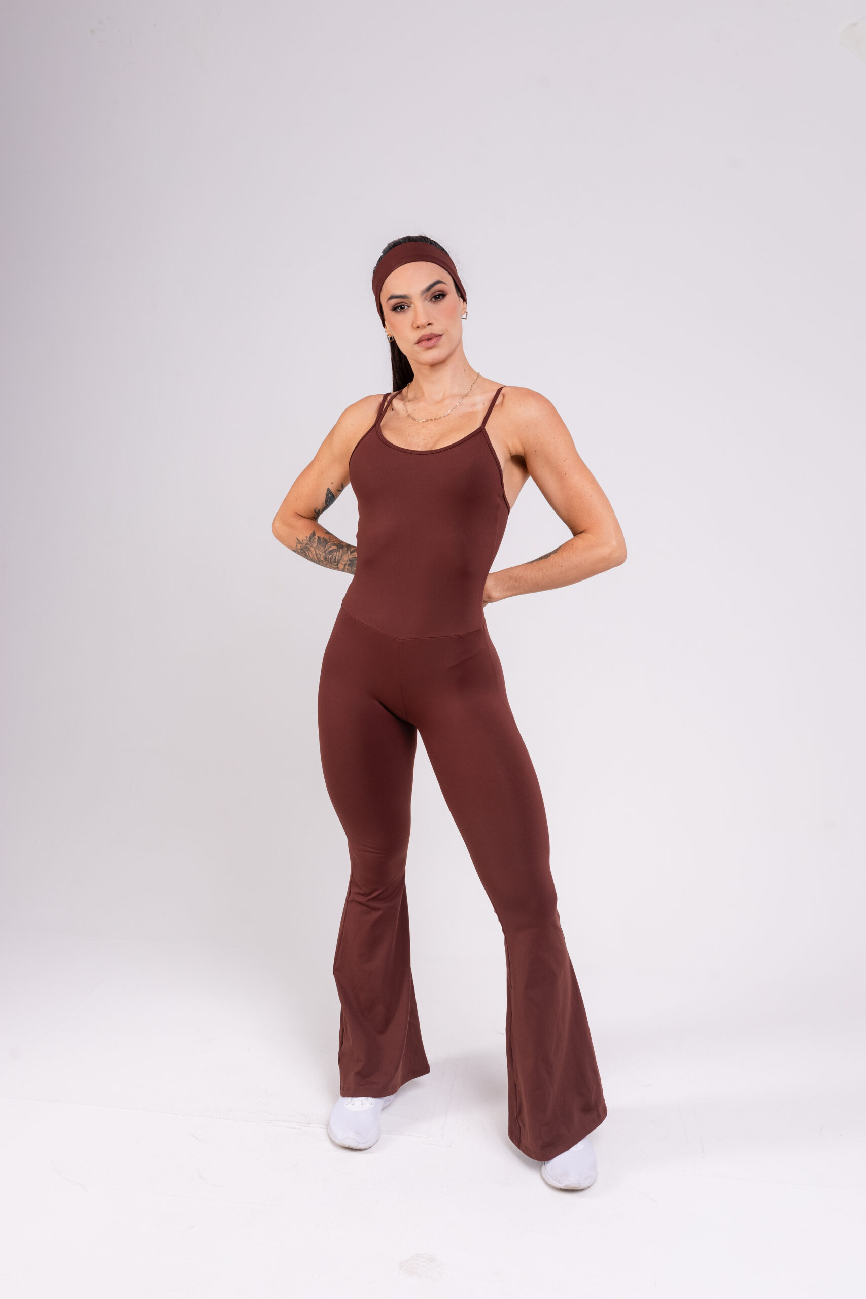 Feito com tecido encorpado, macio e super maleável, ele abraça o corpo, valoriza as curvas e entrega zero transparência. O recorte ajustado no tronco alonga a silhueta, enquanto a calça flare garante um visual elegante e moderno — no treino ou no dia a dia. As alças finas com design cruzado nas costas trazem leveza e um toque sofisticado, sem abrir mão da sustentação.